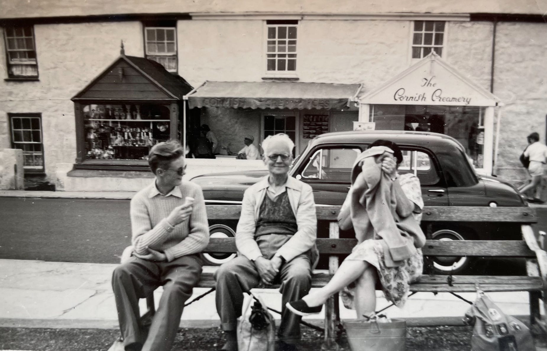 Last week, with the first of many painful ten-year anniversary days approaching, I was feeling the loss of Dad more keenly than I had for a while. I knew I was going to have to write something about it, but what? Hadn’t it already been said? I went through some old letters and photos, hoping for something from Dad’s life that I could use for inspiration - a new, unexplored way of connecting with him. I was leafing through photos of him and Mum during their student days, when a tiny, credit-card-sized photo fell from the pile. It was one I had never seen before: Dad and his parents sitting on a bench. A pretty unremarkable photo and so small I had to squint at it to make out the details. I turned it over to read, in Dad’s beautiful italic hand: “Between Penzance and Newlyn. From right to left, Mother, Father, Me”.
